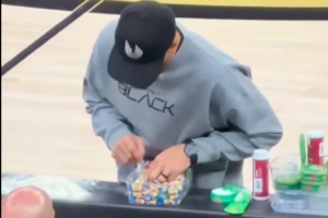 小学生爱吃糖!勇士对篮网时库里在场边偷偷藏糖果