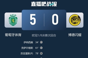 体育资讯3月18日讯 欧冠1/8决赛次回合,葡萄牙体育主场对战博德闪耀,最终葡萄牙体育成功完成让三追五,经过加时赛最终5-0击败对手,总比分5-3晋级欧冠八强。