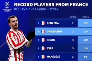 体育资讯2月19日讯 马竞在本轮欧冠3-3战平布鲁日,格列兹曼在欧冠出场数也超越亨利,成为法国球员历史第二人。
