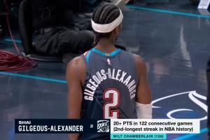 这是亚历山大连续122场砍下20+,距离NBA历史纪录的张伯伦126场仅差4场。